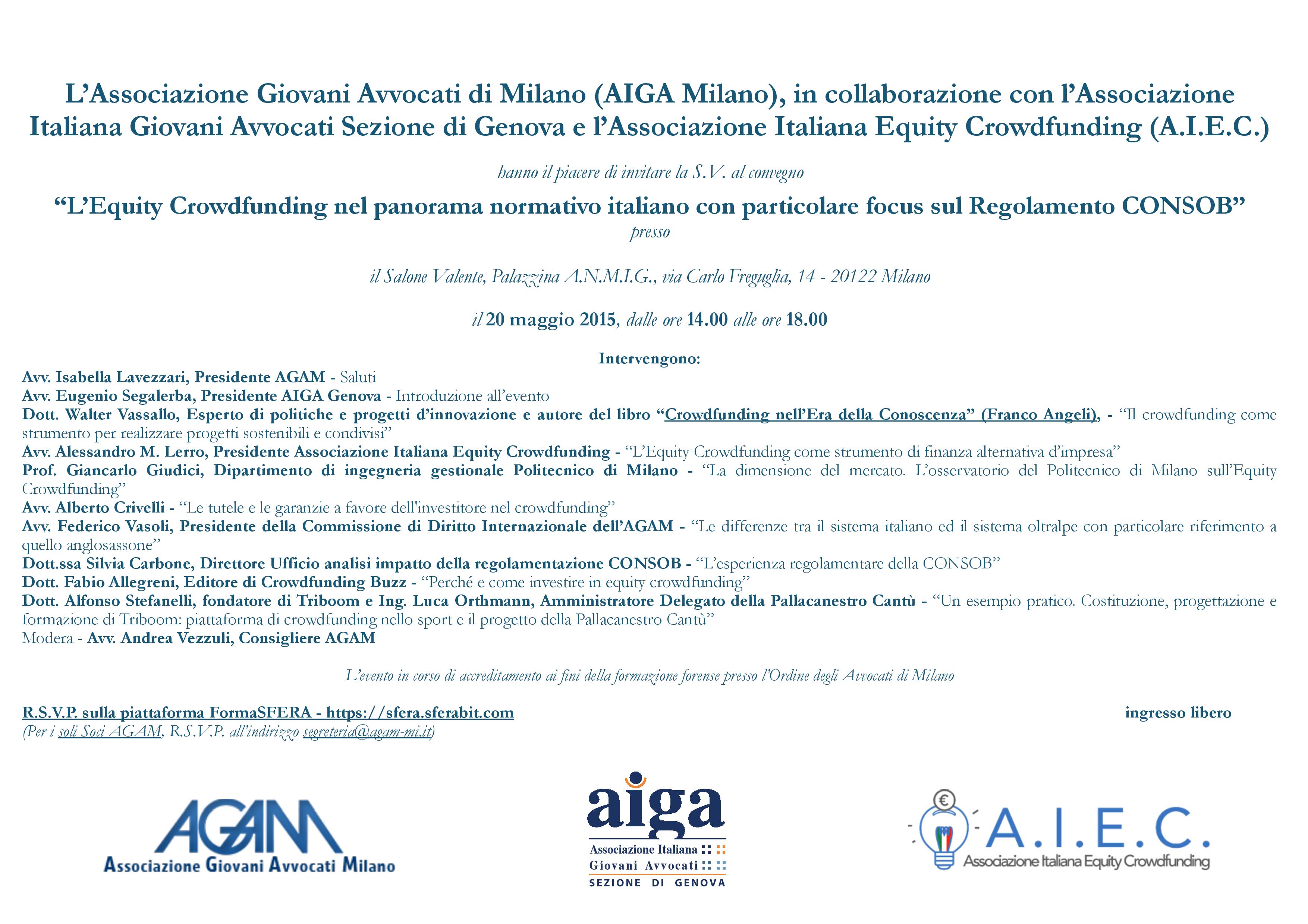 Alessando M. Lerro e Fabio Allegreni, partner di Crowd Advisors, saranno relatori al convegno “L’Equity Crowdfunding nel panorama normativo italiano con particolare focus sul Regolamento CONSOB”, organizzato dall’Associazione Giovani Avvocati di Milano (AIGA Milano), in collaborazione con l’Associazione Italiana Giovani Avvocati Sezione di Genova e l’Associazione Italiana Equity Crowdfunding (A.I.E.C.).