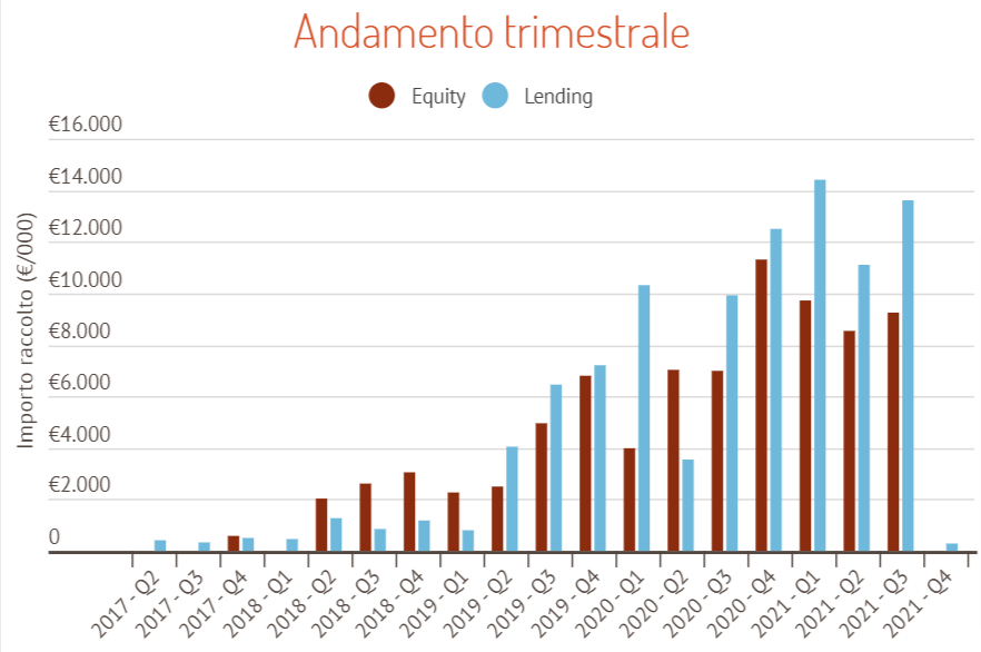 Gli investitori sono mediamente meno, ma investono di più. Infatti, il numero medio di prestatori per ogni campagna è diminuito piuttosto consistentemente (148 nel 2021 vs. 232 nel 2020), ma l’investimento medio è passato a €2.500 nel 2021 da €1.500 nel 2020.