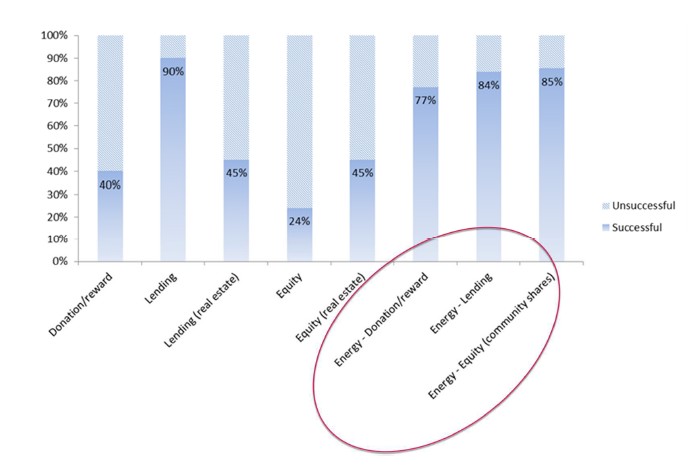 Tutti i tipi di crowdfunding possono essere funzionali a innescare questo circolo virtuoso, come dimostrano i dati riportati nella tabella, i quali, oltretutto, dimostrano come i progetti “energy” abbiano ottenuto tassi di successo più alti rispetto al mercato.