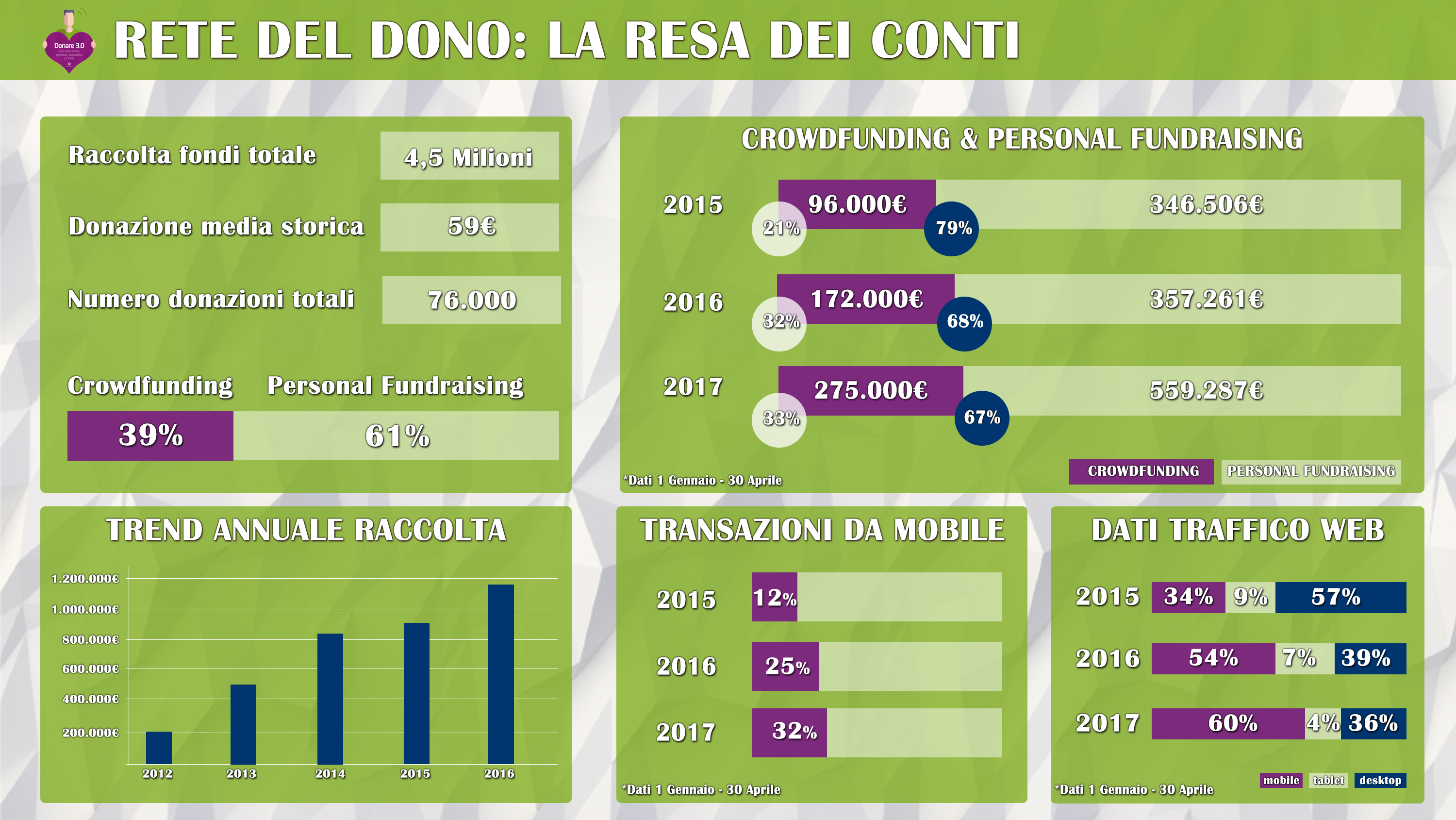 RetedelDono, una delle maggiori e più attive piattaforme italiane di donation crowdfunding, ha raccolto complessivamente 4,5 milioni di Euro, di cui quasi 1,2 milioni solo nel 2016, per una donazione media di €59 (v. infografica sotto).
