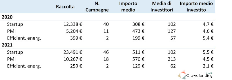 Considerando le piattaforme, nel primo semestre 2021 è Opstart quella con il margine di crescita più eclatante: se nei primi 6 mesi del 2020 aveva chiuso con successo 4 campagne raccogliendo 1,3 milioni, nel 2021 le campagne finanziate sono state 20 con una raccolta decuplicata. Anche Mamacrowd e Crowdfundme hanno presentato margini di crescita importanti: la prima è passata da 8 a 10 imprese finanziate raccogliendo però quasi il doppio, da 5,1 a 10 milioni. La seconda ha ridotto il numero di imprese finanziate (da 14 a 11), ma aumentando la raccolta (da 4,9 a 5,8 milioni). Da sottolineare anche le performance di Backtowork (ridotte da 15 a 13 le campagne di successo, ma aumentata la raccolta da 2,5 a 3,5 milioni) e di WeAreStarting (da 2 a 6 imprese finanziate per una raccolta decuplicata da 100k a oltre 1 milione).