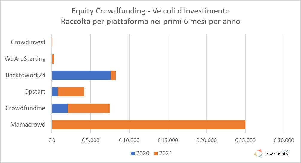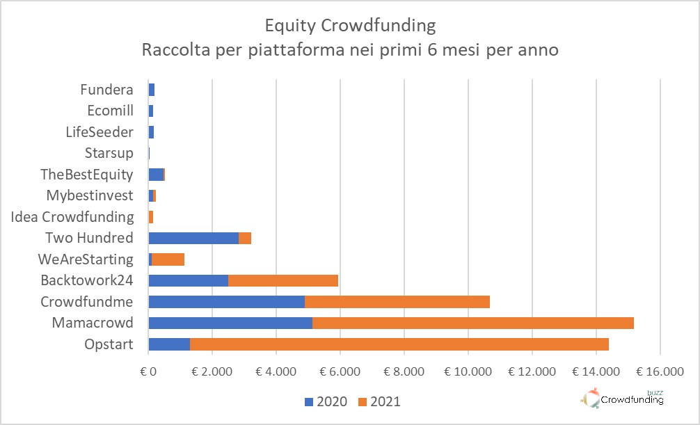 Sono state 6 le piattaforme che hanno ospitato questo tipo di campagne, 3 in più dello stesso semestre dello scorso anno. Oltre alla citata operazione di Mamacrowd, le altre nuove entranti sono state WeAreStarting e Crowdinvest Italia. Le tre piattaforme che avevano già raccolto nel 2020, sono state Crowdfundme (5,4 milioni), Opstart (3,4 milioni) e Backtowork (0,6 milioni).