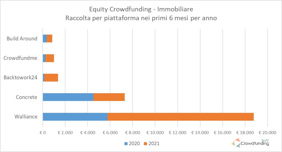 La piattaforma che più ha contribuito alla crescita è stata la leader di settore Walliance con 13 milioni raccolti (contro 5,7 del primo semestre 2020) e 6 progetti finanziati. Concrete Investing, che aveva raccolto 4,5 milioni nel 2020 con 2 progetti, ha finanziato sempre due progetti ma con una raccolta ridotta a 2,8 milioni. Da segnalare infine che le altre 3 piattaforme che avevano proposto e finanziato progetti immobiliari nel 2020 si sono confermate anche quest’anno, tutte incrementando la rispettiva raccolta: Backtowork con un progetto da 1,2 milioni, Crowdfundme, con 2 progetti per 758k e Build Around con un progetto per 500k.