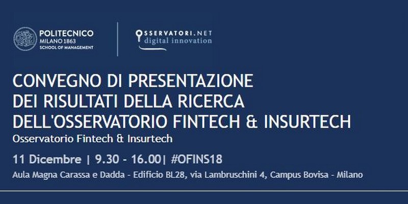 Il prossimo 11 Dicembre L’Osservatorio Fintech & Insurtech del Politecnico di Milano, presenterà il report “Fintech & Insurtech: l’italia spiega le vele”, con il patrocinio di Assofintech.