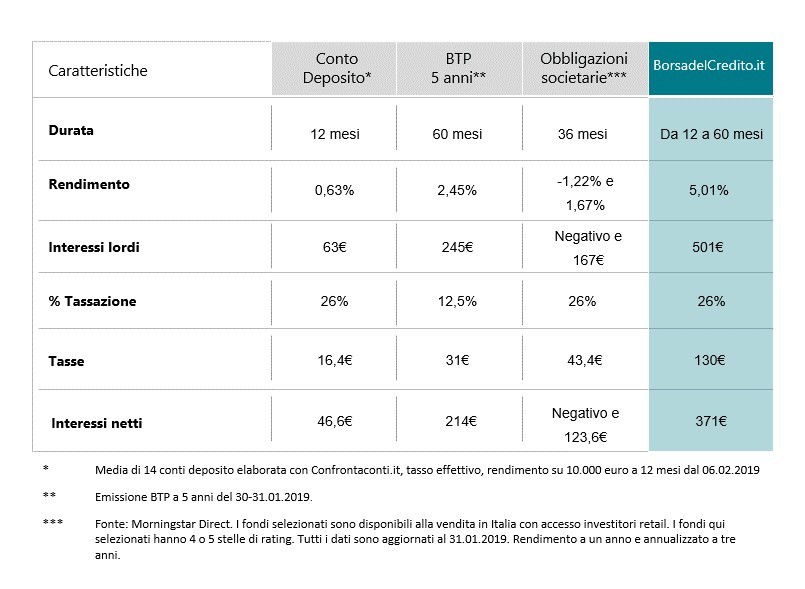 Il confronto con i ritorni di altri investimenti in strumenti di debito danno l’idea di quanto rilevante sia quello della piattaforma di P2P Lending. Secondo BorsadelCredito, infatti:
