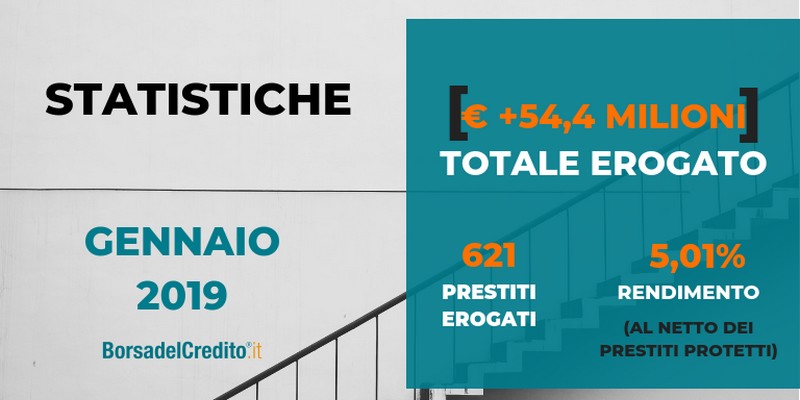 BorsadelCredito, P2P Lending italiano di prestiti alle PMI, ha registrato a gennaio 2019 un erogato complessivo di 54,384 milioni dai 52,396 di fine 2018. Una cifra più che doppia rispetto a quella registrata a gennaio 2018, quando l’erogato era ammontato a 24,619. I prestiti complessivi concessi sono 621, dai 604 di dicembre e dai 404 di un anno fa.