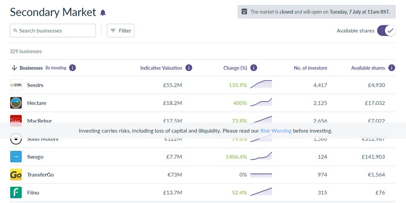 Il mercato secondario di Seedrs è aperto alle transazioni una settimana al mese, dal primo martedì del mese al martedì successivo, anche se chi vende può postare le proprie offerte a mercato chiuso.